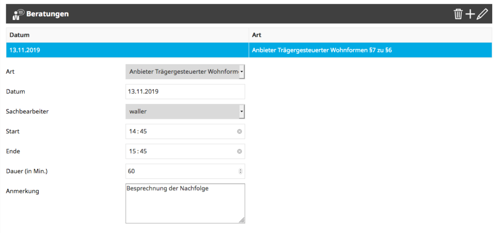 Tragen Sie die Eckdaten der Beratung und eine Anmerkung ein.